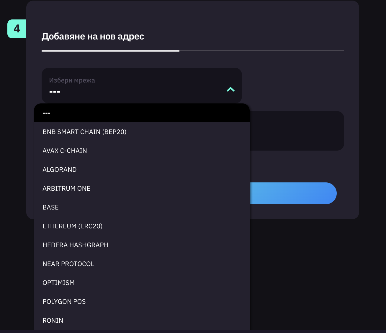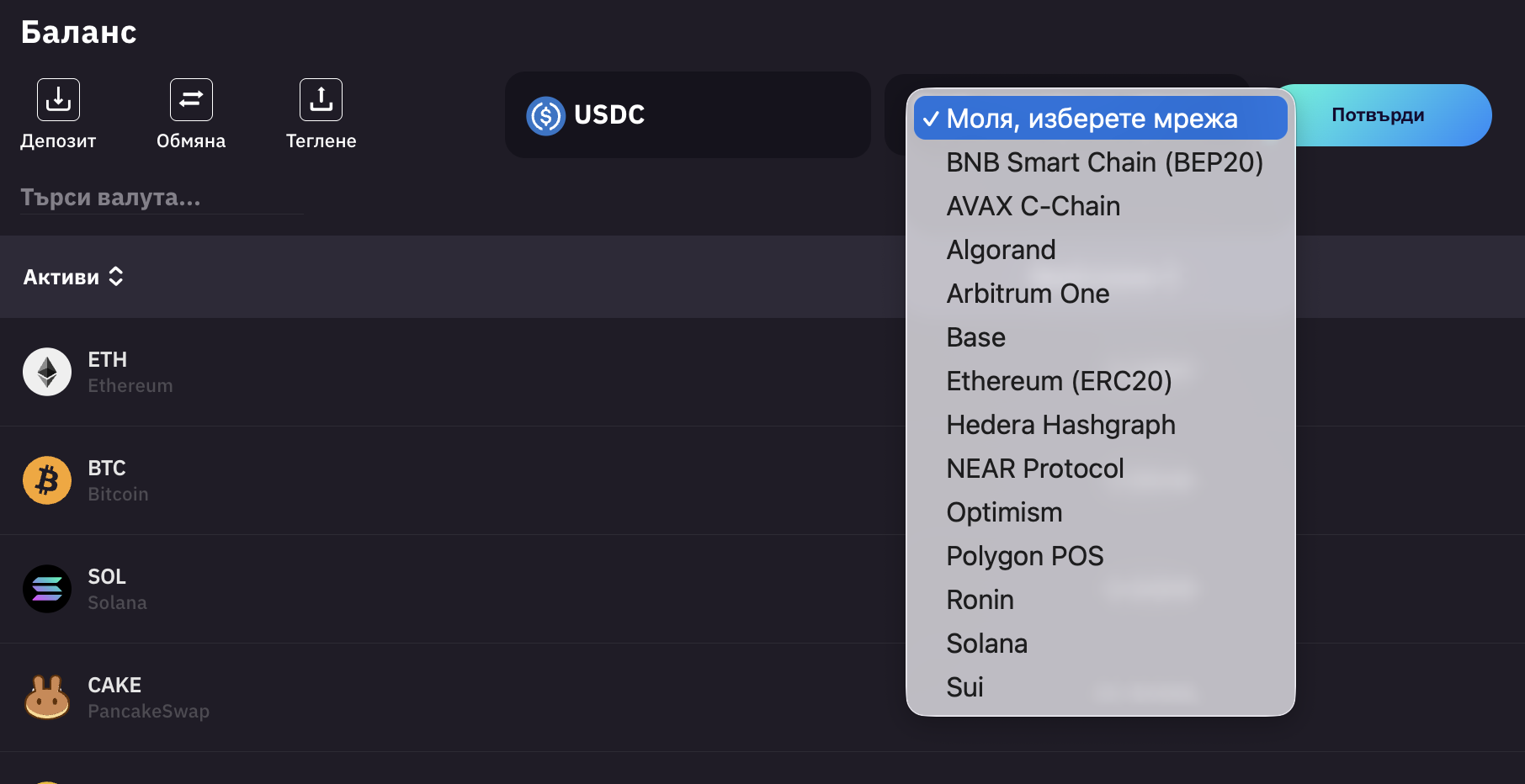 От двете падащи менюта можете да изберете криптоактива и мрежата, в която тя оперира.