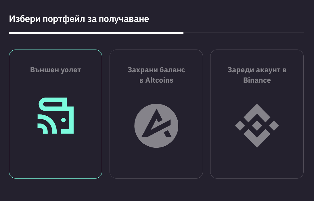 Изберете портфейла за получаване. В този случай изберете „External Wallet“.