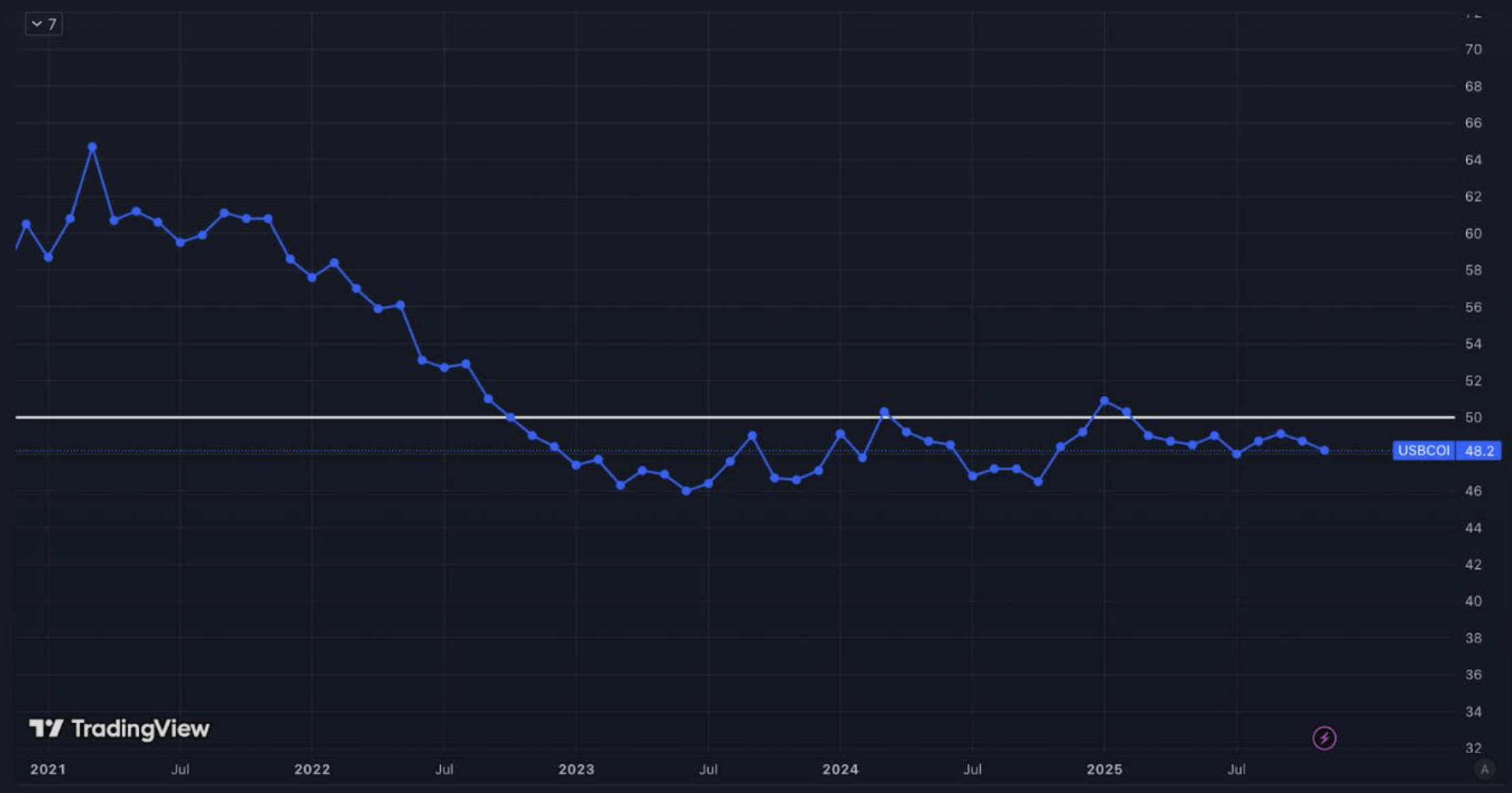 - над 50 – икономиката расте (добро за алткойните)
