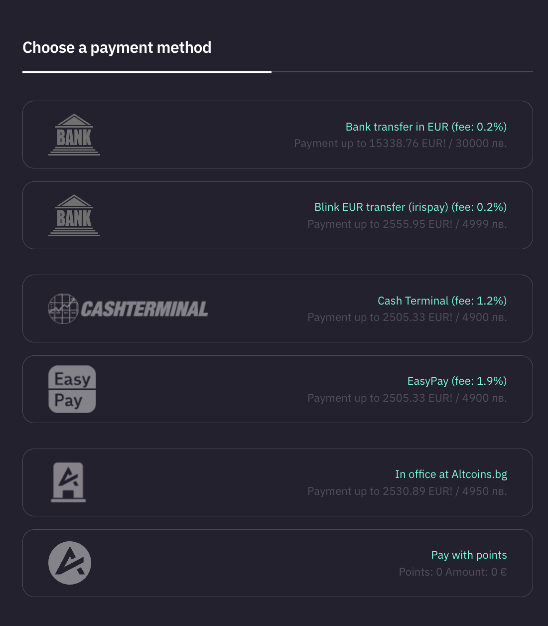 - Create your order: Choose the amount and the crypto you want, then proceed to the payment method selection as usual.