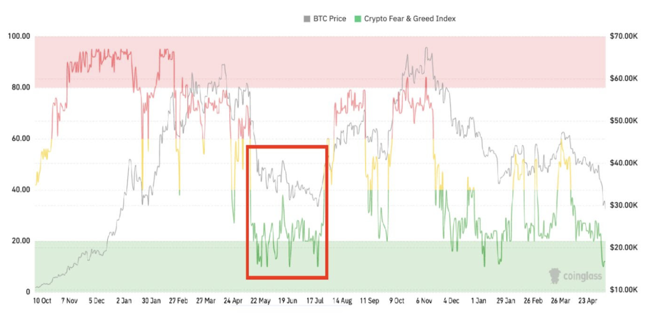 Това е най-ниското ниво на пазарния страх от 2022 г., когато Terra–Luna потопи половината пазар със себе си. Определено не е най-приятното място за висене.