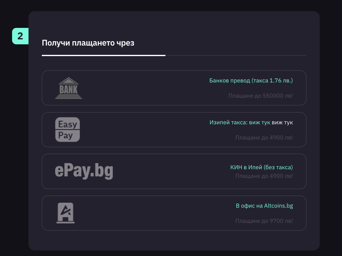 Направете превода на койните. След като ги получим по нашия уолет, ще завършим вашата поръчка и ще получите имейл за потвърждение. Това означава, че вашето плащане в лв. е наредено към избрания от вас метод. Готово!