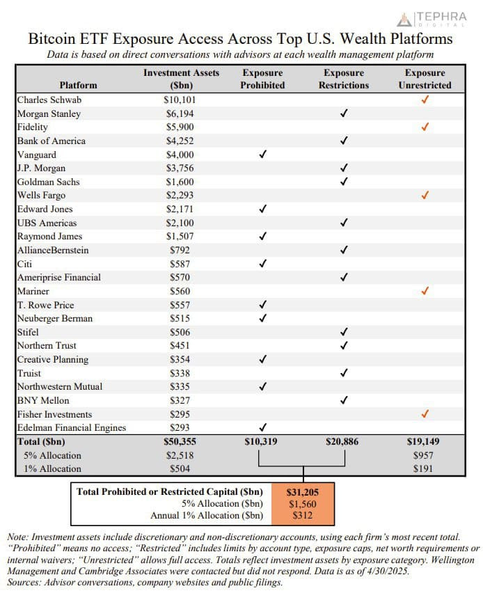Компанията Tephra публикува графика, която показва, че повечето големи платформи за управление на богатство в САЩ все още ограничават достъпа до Bitcoin за своите клиенти.