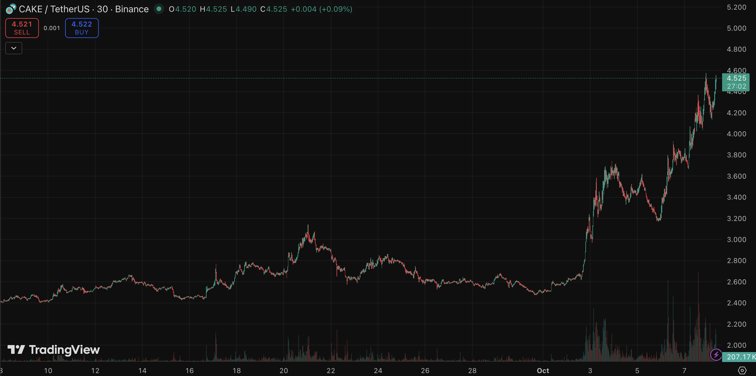 Но не е само това. PancakeSwap (CAKE) – първата и най-голяма децентрализирана борса на BSC – също отчита силни ръстове в последните дни. Заедно тези два проекта показват колко „жива“ е екосистемата и защо $BNB печели от всяко ново движение там.