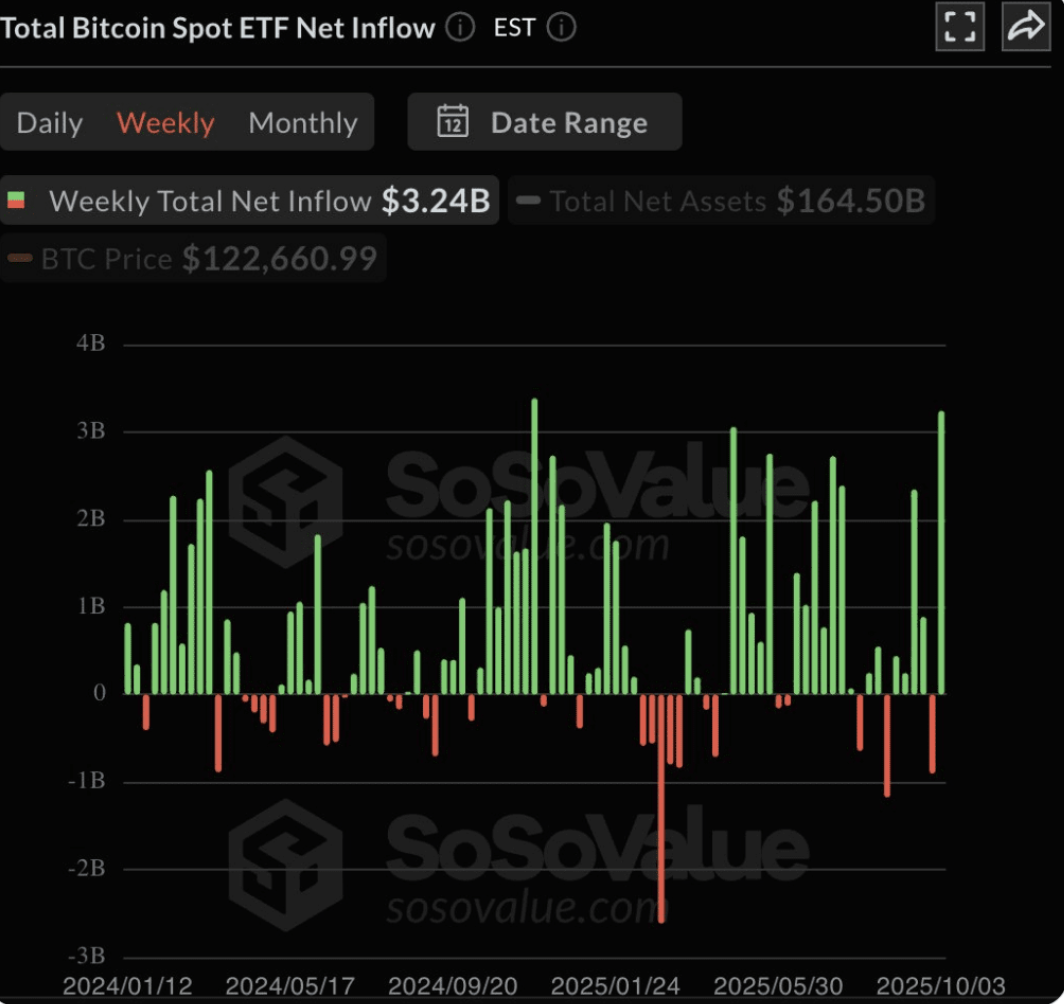 Темата за „второто място“ продължава и на седмична база – U.S. Bitcoin ETF-ите записаха вторите най-високи седмични входящи потоци, откакто рекордът от $3.38B бе поставен през ноември миналата година.