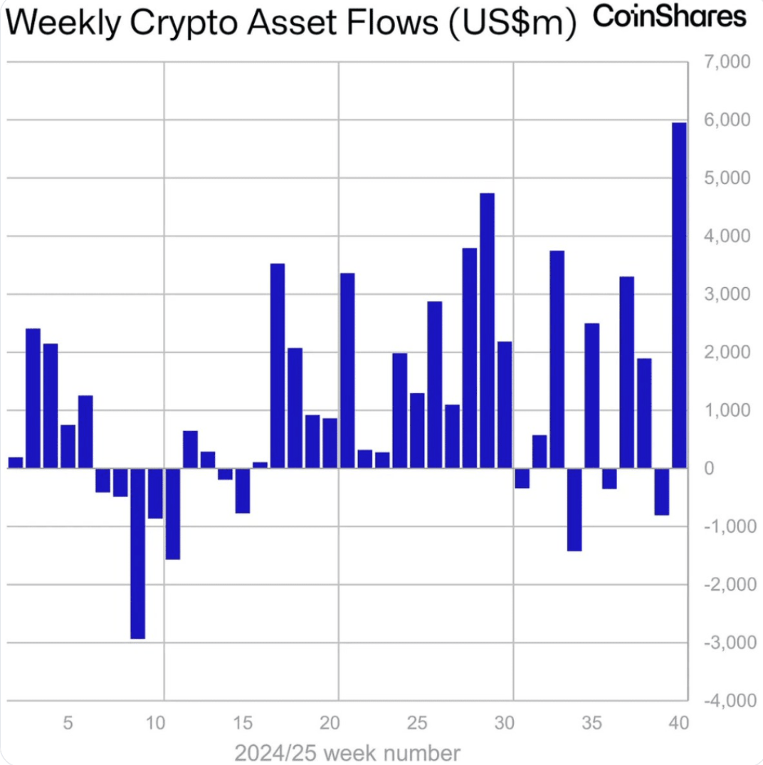 Миналата седмица инвестиционните продукти в дигитални активи отчетоха безпрецедентни входящи потоци в размер на $5.95 милиарда.