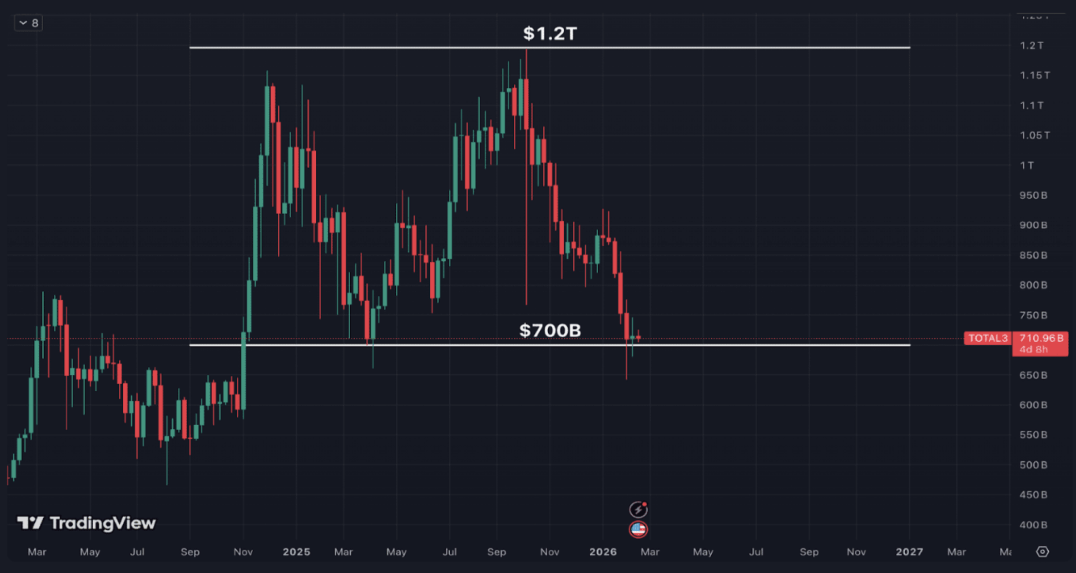 Общата пазарна капитализация на алткойните се задържа около 700 милиарда долара. Това е сериозен спад спрямо върха от 1.2 трилиона миналата година, но пазарът продължава да се движи в рамките на диапазона, който наблюдаваме от ноември 2024 г.