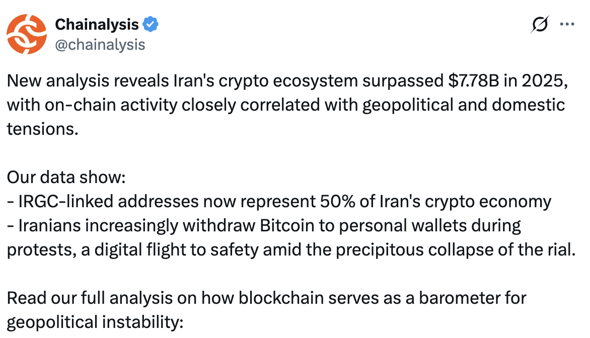 Според данни от Chainalysis криптоекосистемата на страната е надхвърлила $7.78 млрд. on-chain обем през 2025 г., като активността силно корелира с вътрешно напрежение и обезценяване на риала.