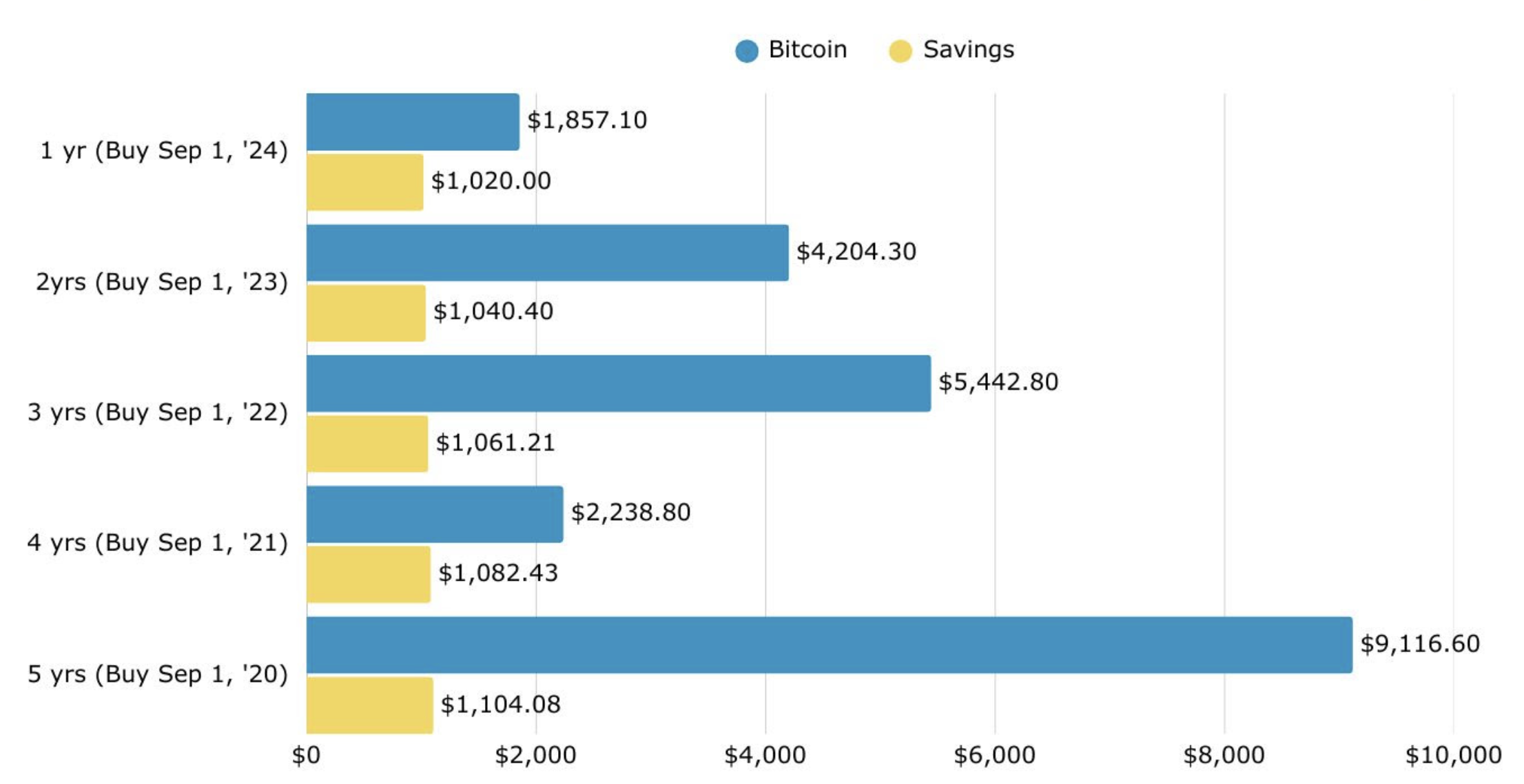 Сравнение между $1,000 в Биткойн и $1,000 в спестовна сметка (2% годишно) за период от 1 до 5 години.