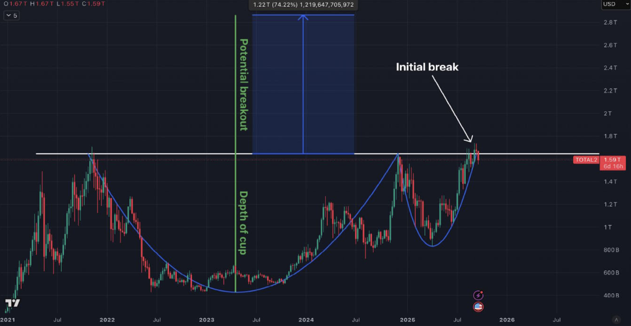 TOTAL2 (общата пазарна капитализация без $BTC) наскоро проби нагоре от формация „cup and handle“, изграждана в продължение на цели 4 години.