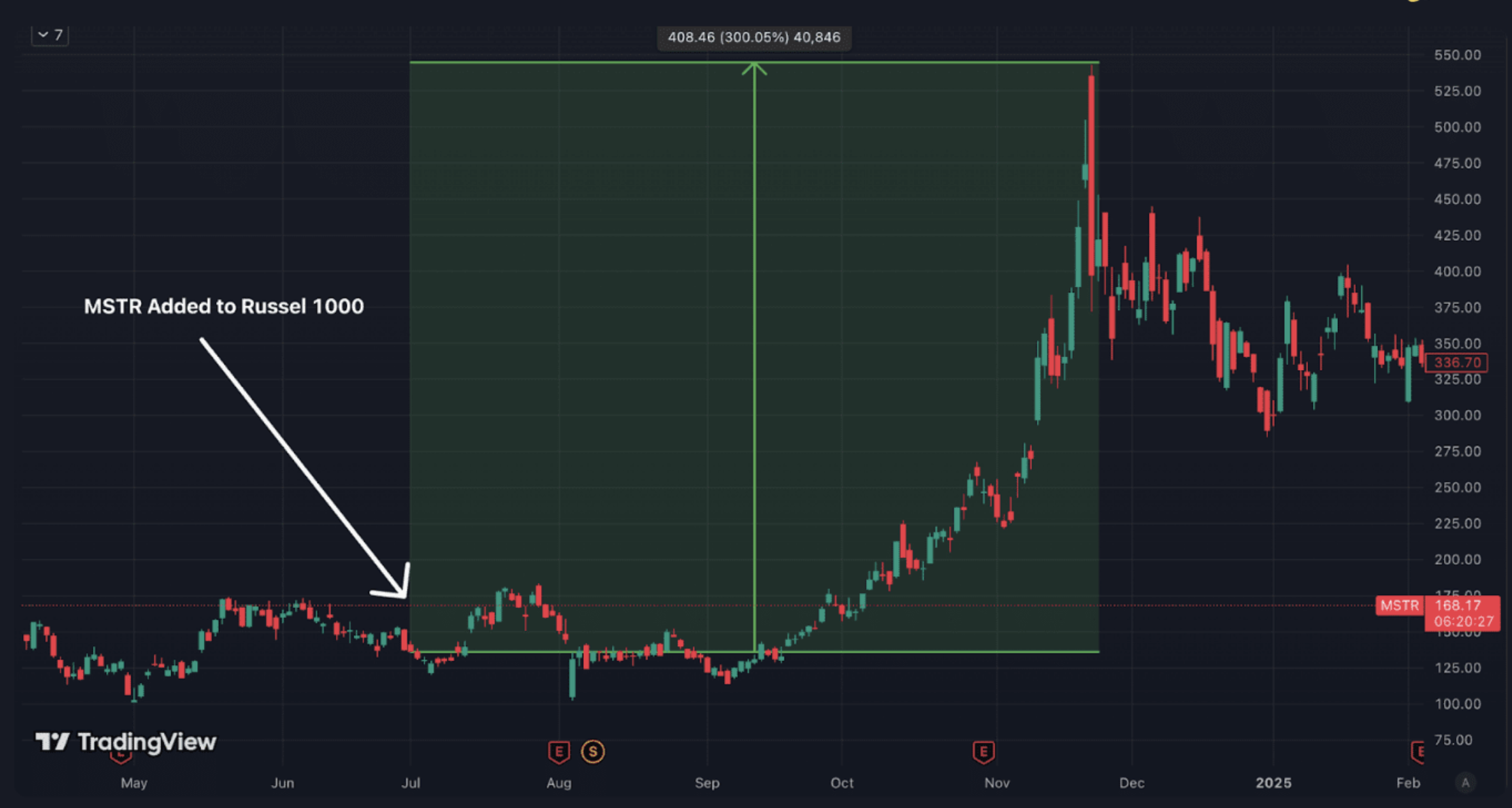 Точно това помогна и на MicroStrategy. След включването им в индекса Russell 1000 на 30 юни 2024 г. компанията отбеляза ръст от около 300 процента за следващите шест месеца. Комбинация от институционални покупки и силен пазар.