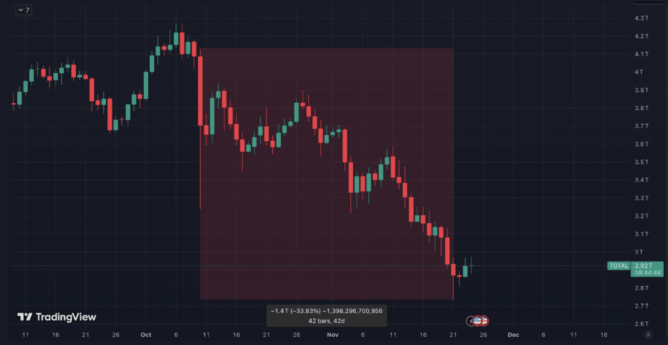 За 42 дни от пазара изчезнаха близо 1.4 трилиона долара пазарна капитализация.