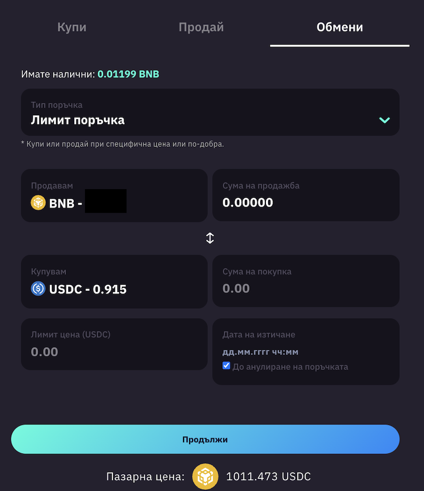- При лимит покупка (напр. Продавам USDC, Купувам BNB) въведи цената в USDC, която си готов да платиш за 1 BNB. Поръчката се изпълнява, когато пазарът слезе до тази цена.