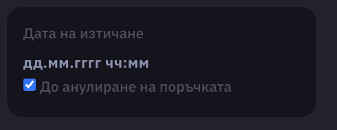 - С дата на изтичане – попълни дата и час в полето Дата на изтичане. След този момент поръчката се затваря автоматично, ако не е изпълнена.