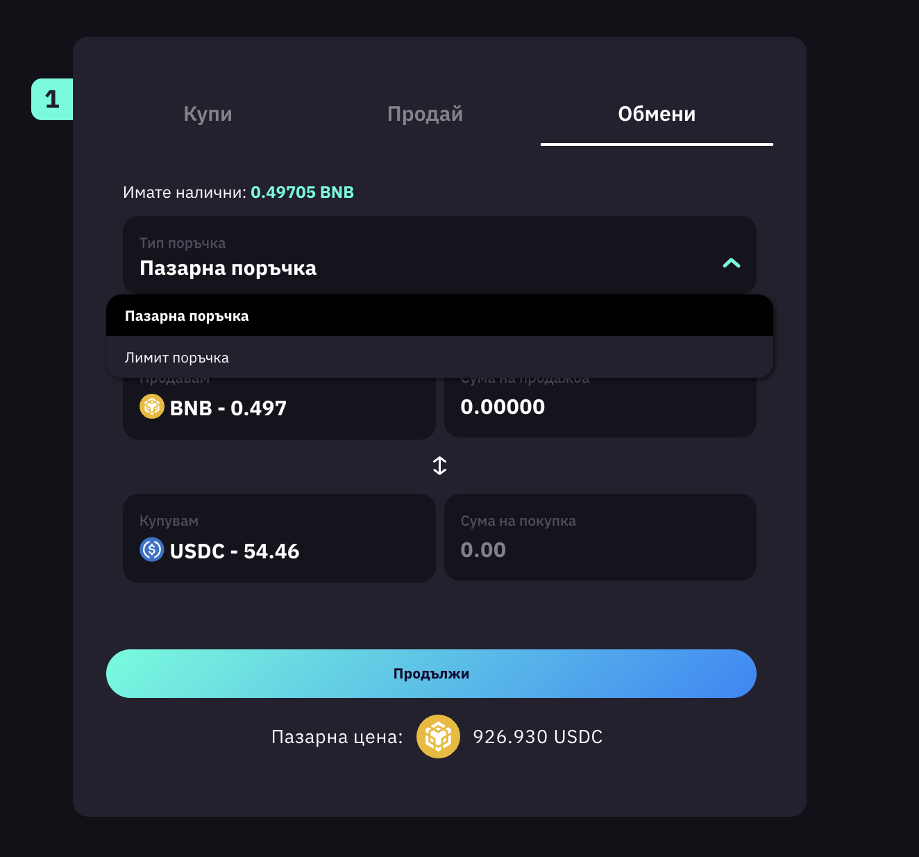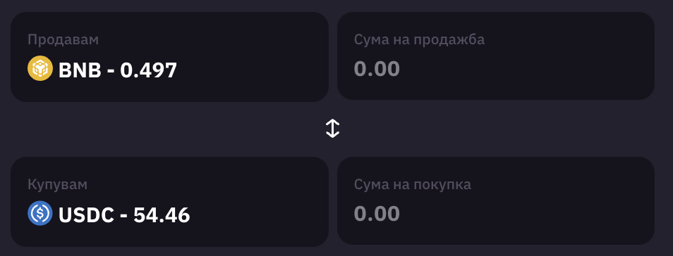 Забележка: За ваше удобство, когато изберете валута, различна от USDC за продажба, в полето за покупка автоматично се зарежда USDC.
