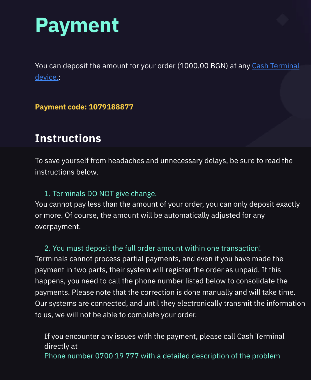 After finishing a purchase order with Cash Terminal as the payment method, you’ll see a 10‑digit code like this: