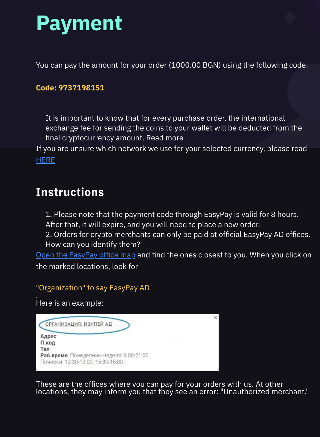 These are the offices where you can pay your orders. At others you’ll get “Unauthorized merchant” errors.