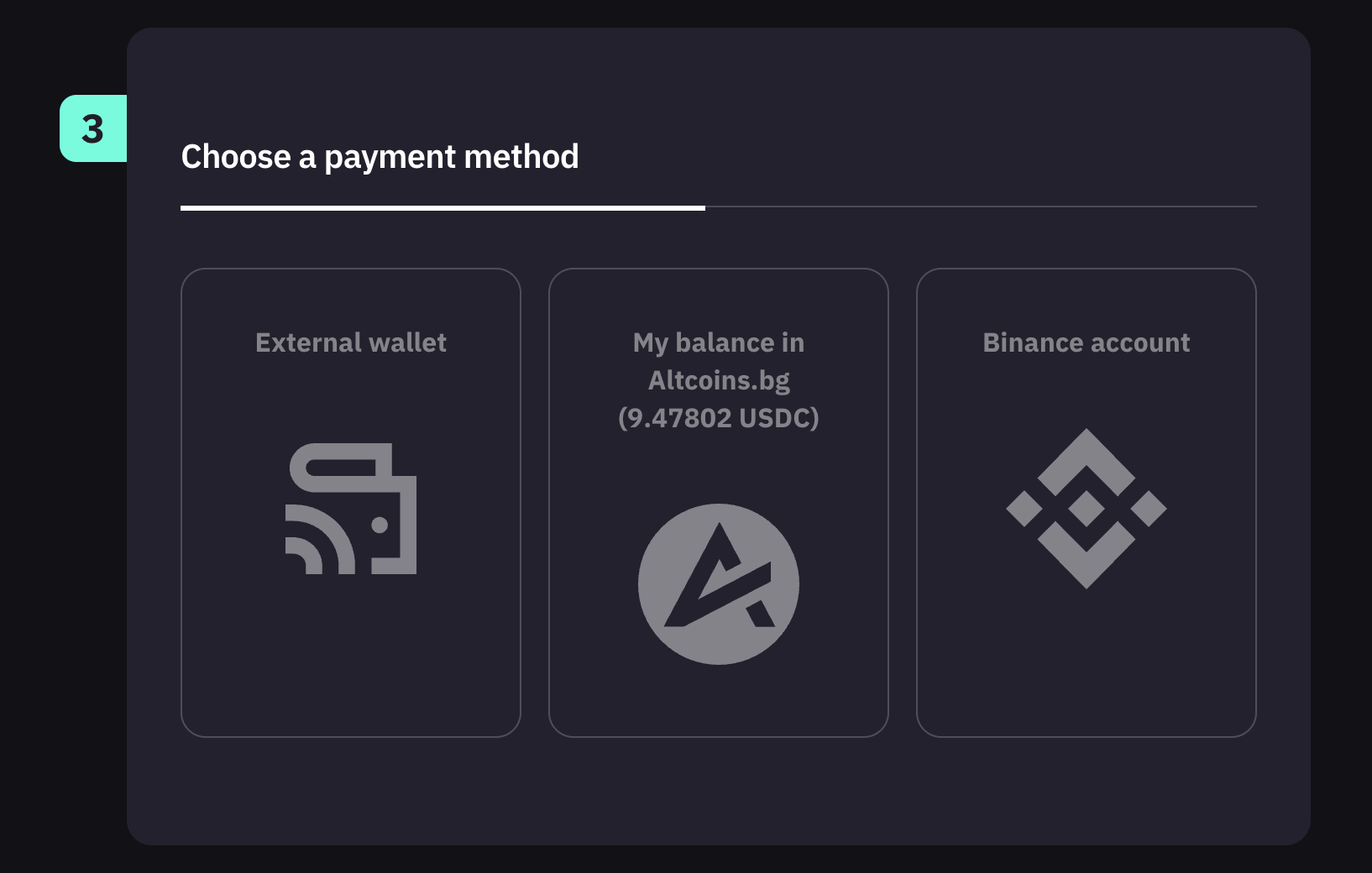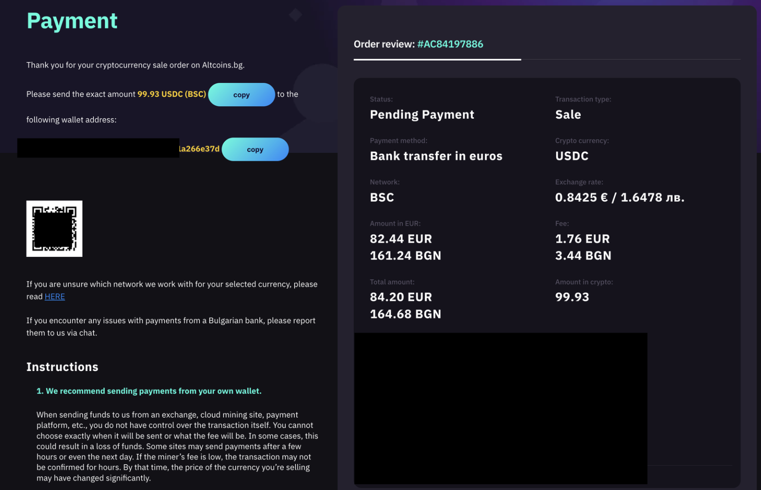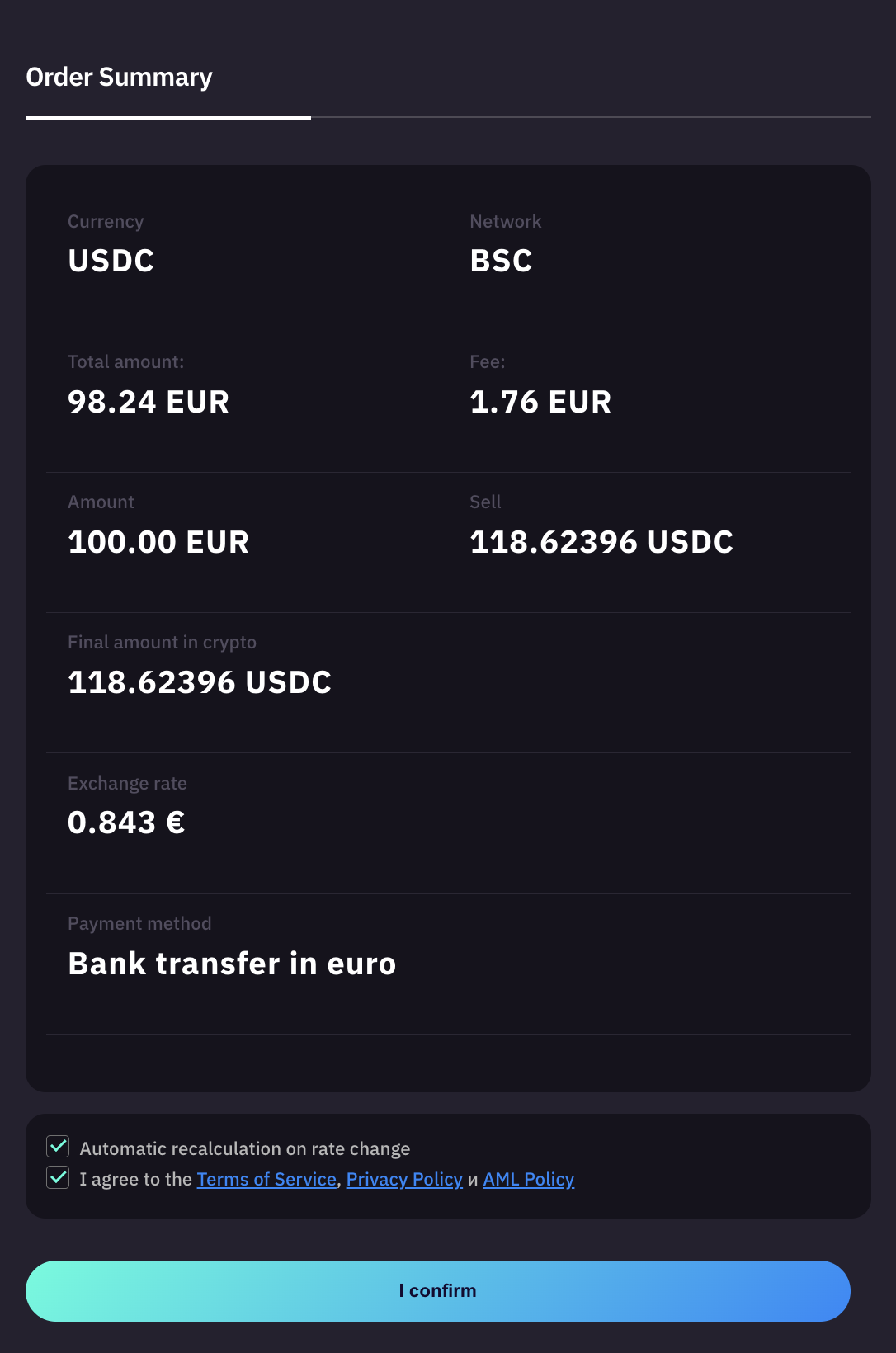 Transfer the coins. Once we receive them in our wallet, we’ll finalize your order, and you’ll receive a confirmation email. This means your payment in EUR has been sent via your chosen method. Done!
