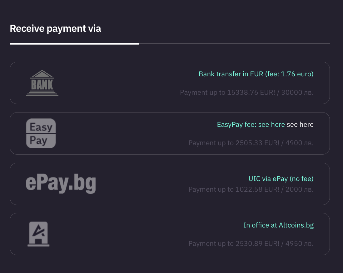 If you choose a bank transfer, the service will cost you 1.76 EUR. We can make payments to any bank in Bulgaria.