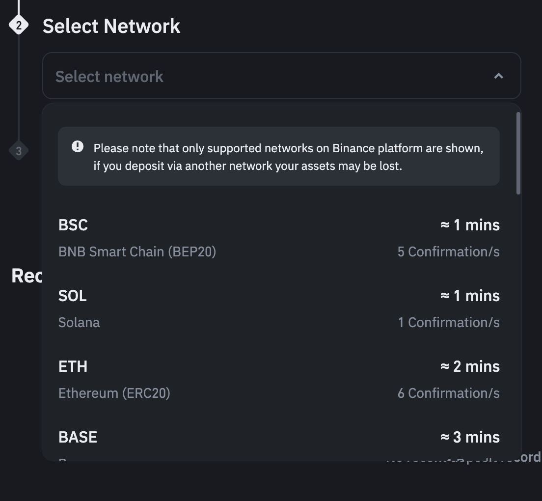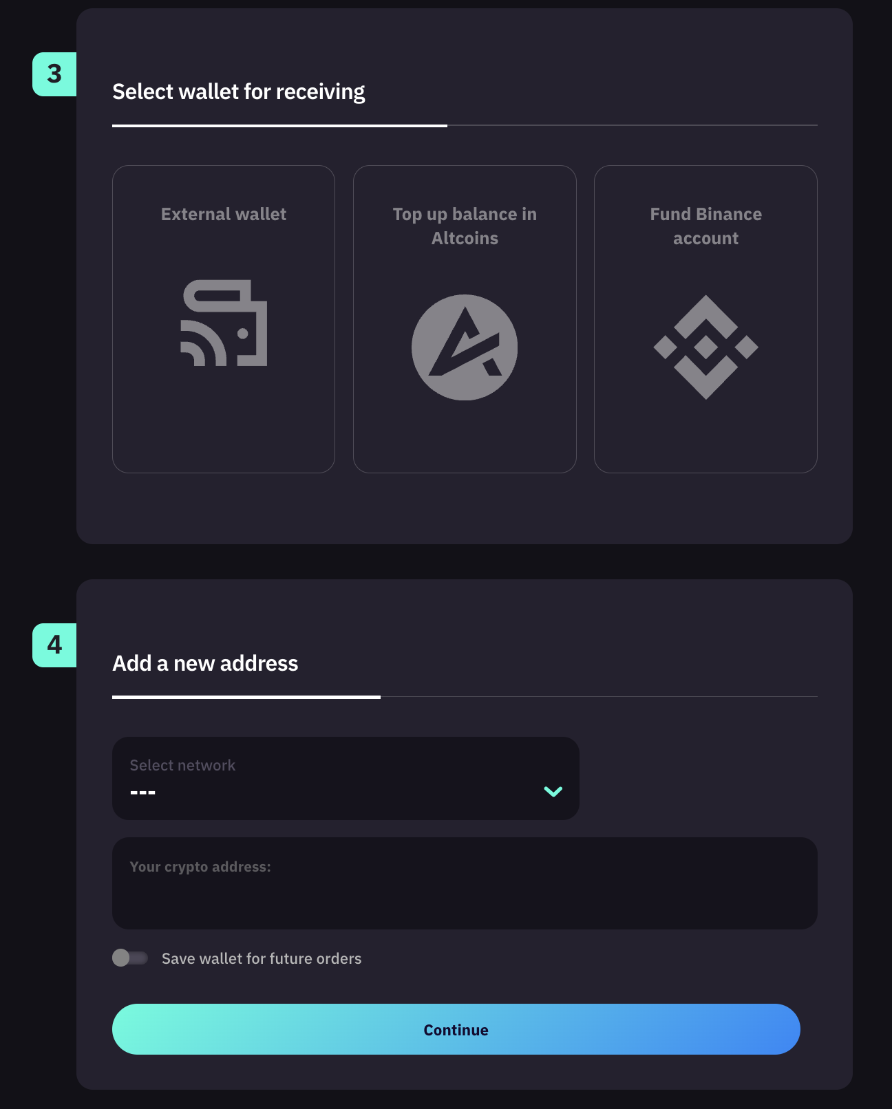 Enter the purchase amount, your preferred payment method, and in the Your crypto address field, paste the deposit address copied from Binance.