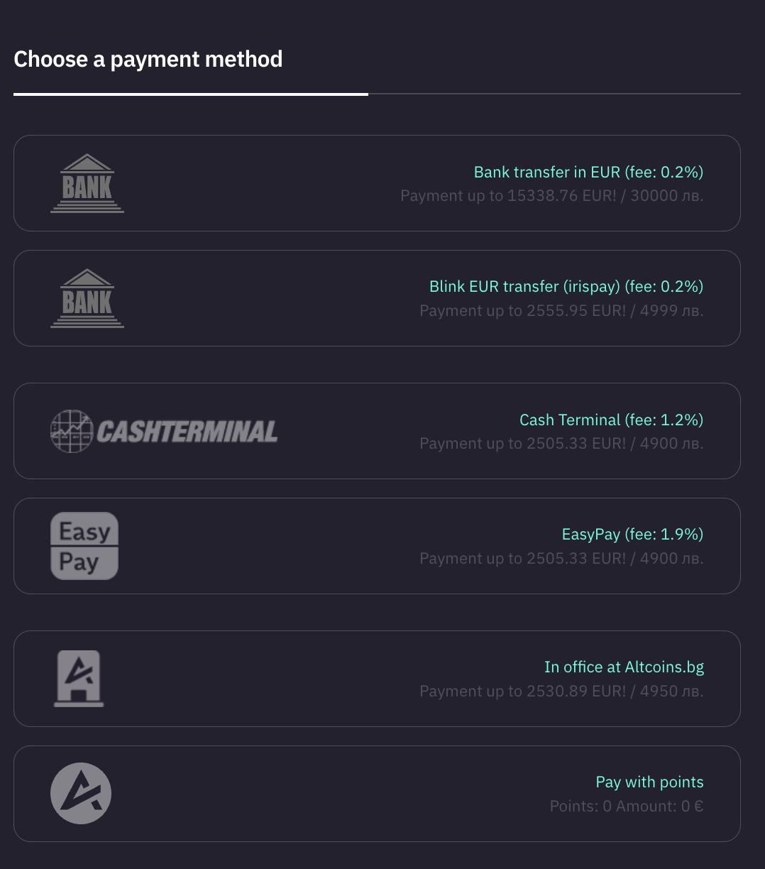 We offer payment methods that allow the corresponding coins to reach your account within minutes. Additionally, if you try to fund your account with a larger amount, any Bulgarian bank will likely reject the transfer and not allow it. So, if you’re serious about engaging with crypto, you should definitely consider depositing and withdrawing through Altcoins.bg.