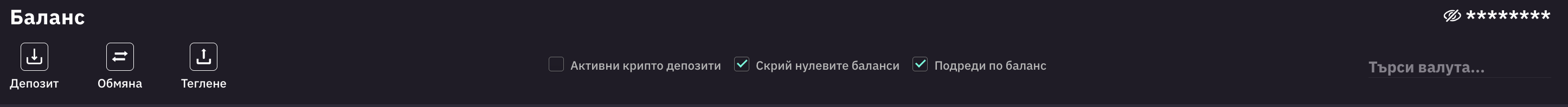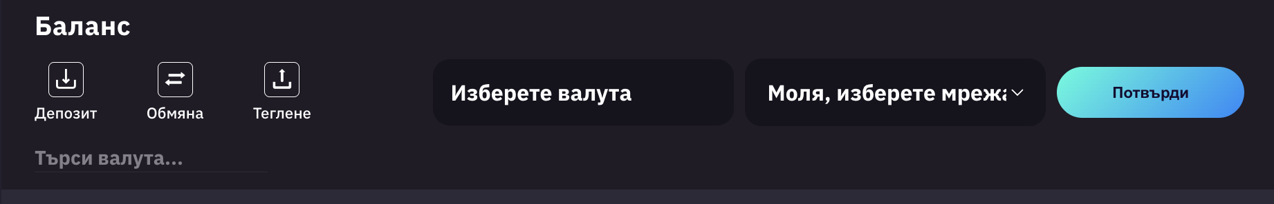 В дясно може да видите три бутона, които ни служат съответно за депозит, крипто към крипто обмяна и теглене.